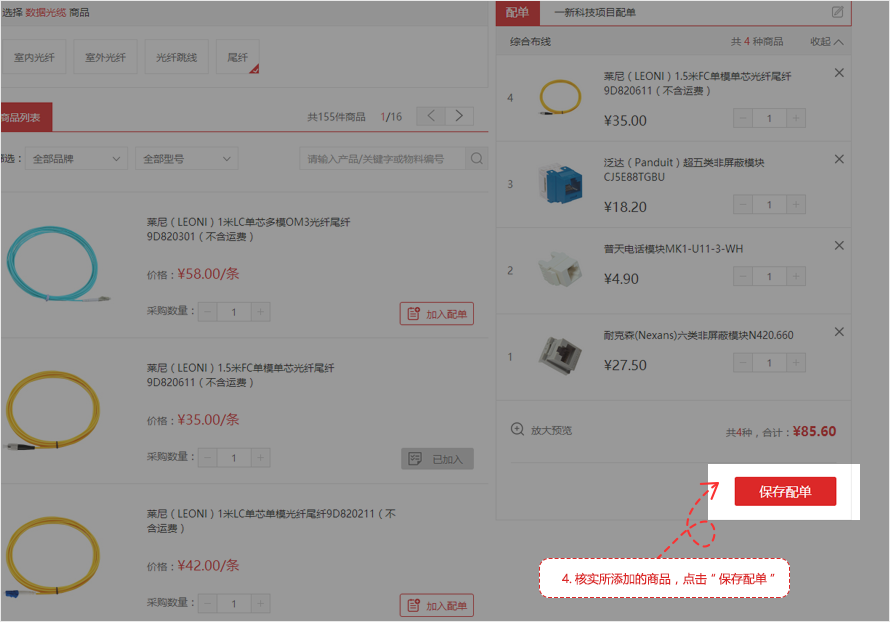 3.通过类别筛选或搜索找到所需商品, 选择数量后,点击“加入配单”